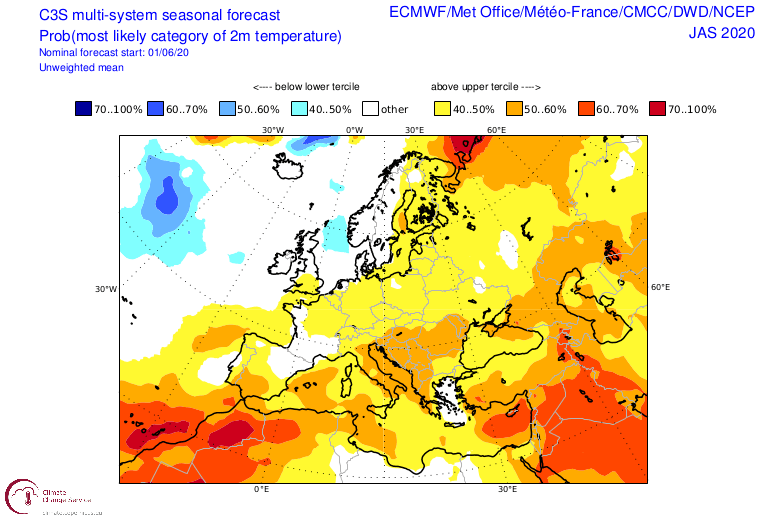 Vi gir her varsler for temperatur som gjelder for juli 2020 og er basert på sesongvarslingsmodeller fra følgende sentre: Deutscher Wetterdienst i Tyskland, ECMWF (det europeiske værvarslingssenteret) i England, UK Met Office i Storbritannia, Météo France i Frankrike og Centro Euro-Mediterraneo sui Cambiamenti Climatici Italia. Et alternativt sesongvarsel basert på de samme modellene (pluss en amerikansk modell) finnes på EU sin tjeneste Copernicus Climate Change Service her.