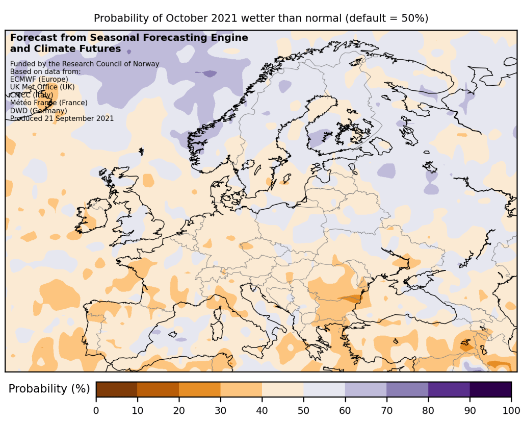 Sannsynligheten for at oktober 2021 vil tilhøre gruppen «våtere enn normalt» i forhold til referanseperioden 1993–2020. Det globale gjennomsnittet er 52%.