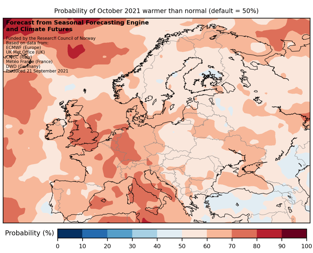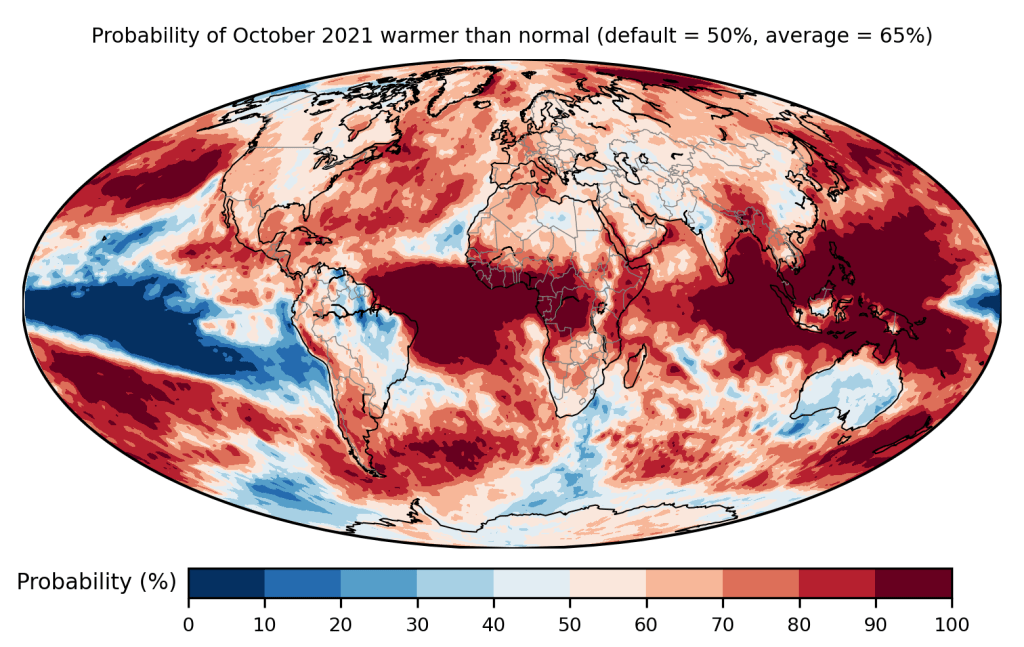 Sannsynligheten for at oktober 2021 vil tilhøre gruppen «varmere enn normalt» i forhold til referanseperioden 1993–2020. Det globale gjennomsnittet er 65%.