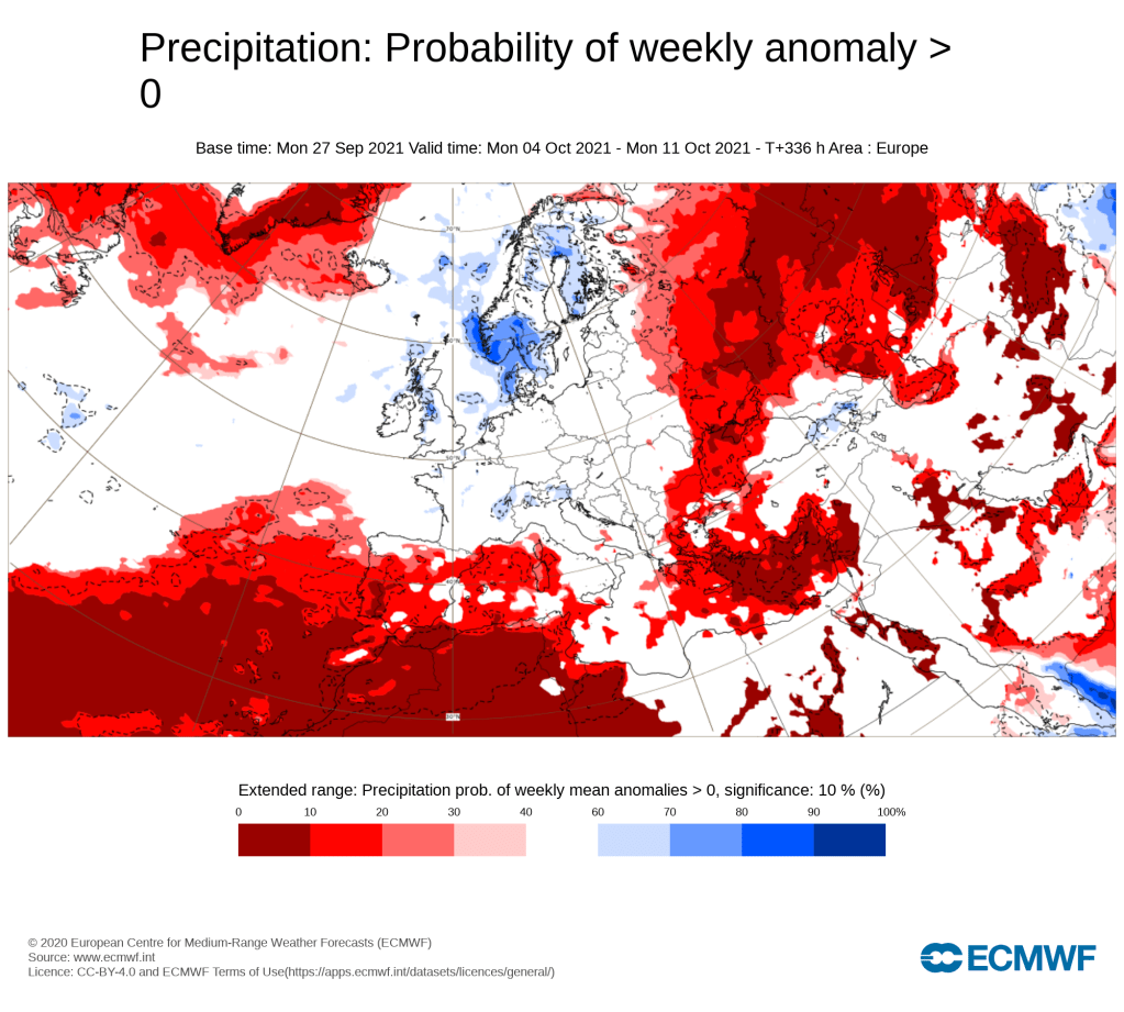 Sannsynlighet for mer nedbør enn normalt i løpet av uke 40, ifølge månedsvarselet fra ECMWF, produsert 27. september.