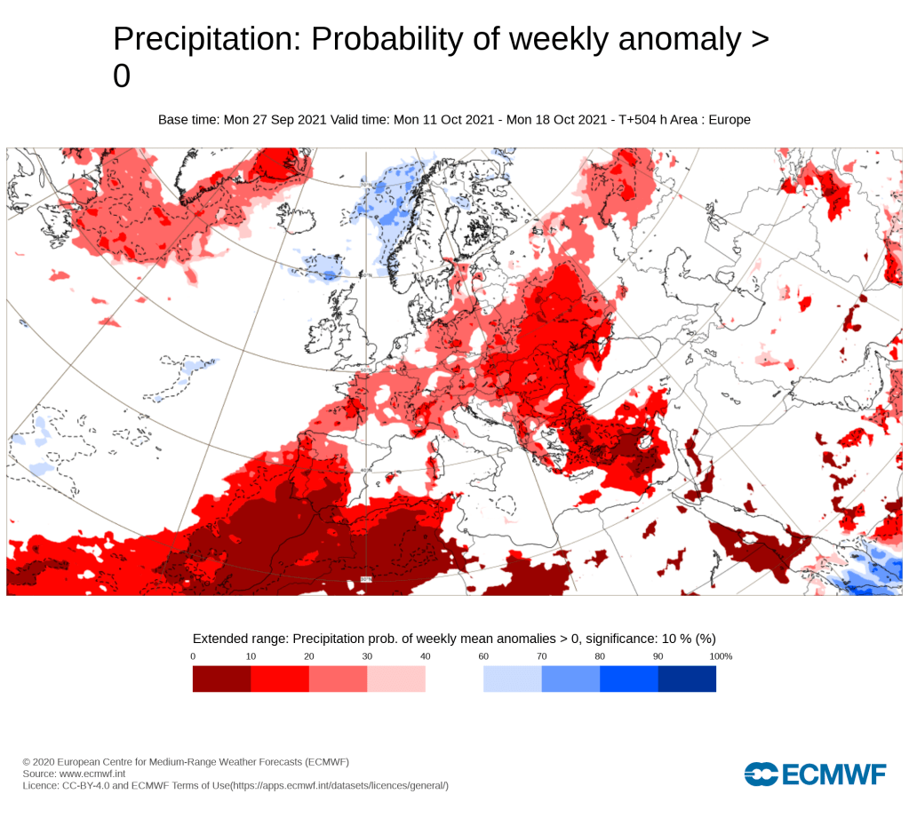 Sannsynlighet for mer nedbør enn normalt i løpet av uke 41, ifølge månedsvarselet fra ECMWF, produsert 27. september.