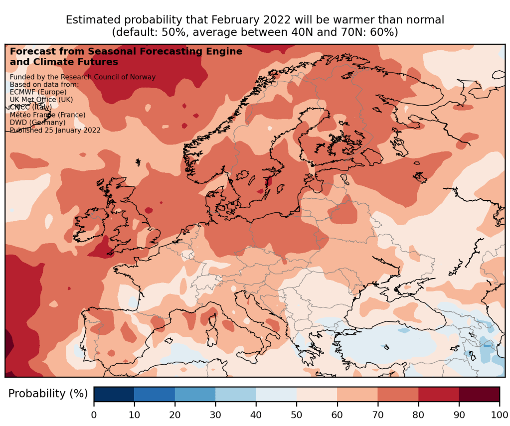 Vi ser på temperaturvarselet for hele kloden i februar først. Fargene under viser beregnet sannsynlighet for at februar 2022 blir varmere enn normalt (gjennomsnittet for perioden 1993–2021).