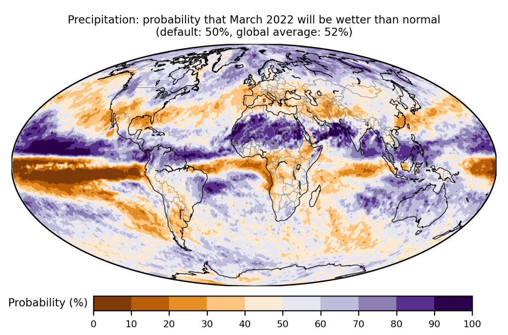 Først ut er et temperaturvarsel for hele jorden i mars. Fargene viser beregnet sannsynlighet for at måneden blir varmere enn normalt (gjennomsnittet for perioden 1993–2021).