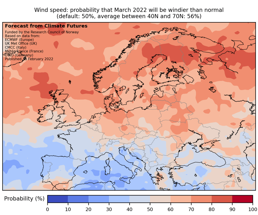 Vi ser også denne gangen på vindhastighet. Dette er viktig for strømprisene i Norge, ettersom det produseres mye vindkraft i Storbritannia, Danmark og Tyskland. Her er beregnet sannsynlighet for at det skal blåse mer enn normalt i mars: