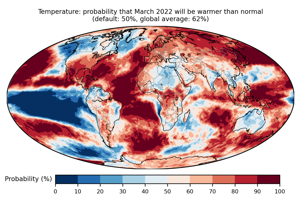 Først ut er et temperaturvarsel for hele jorden i mars. Fargene viser beregnet sannsynlighet for at måneden blir varmere enn normalt (gjennomsnittet for perioden 1993–2021).