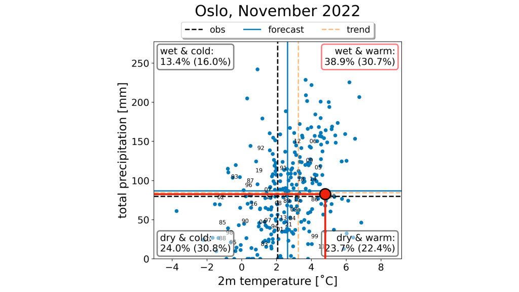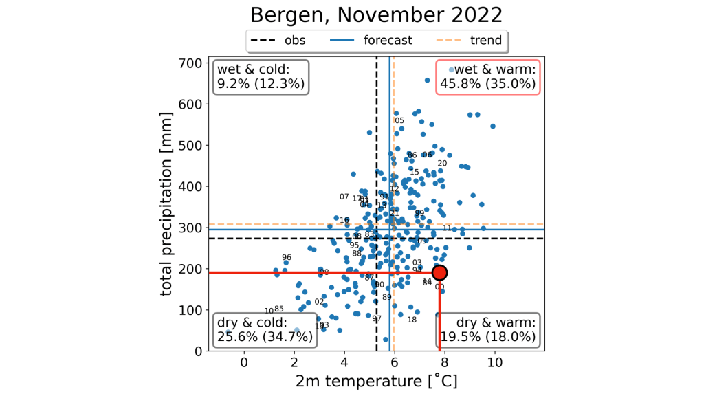 Figur 1. Prognose for akkumulert nedbør (y-aksen, i millimeter) og gjennomsnittlig temperatur (x-aksen, i grader) i november 2022 i Bergen. De blå prikkene viser hver av modellprognosene. Tallene indikerer målt temperatur og nedbør i november hvert år siden 1990-tallet. De sorte linjene viser gjennomsnittlig temperatur for perioden 1993–2016, som er modellenes referanseperiode. De blå linjene viser gjennomsnittet av modellprognosene. De gule linjene viser forventet nedbør og temperatur i november 2022 i henhold til en lineær trend de siste tiårene. Teksten i de fire kvadrantene (delene av hver graf) sier hvor stor andel av prognosene som finnes i hver kvadrant i forhold til referanseperioden, og tallene i parentes angir hvor stor andel som modellene vanligvis plasserer i hver kvadrant. De røde linjene og sirkelen viser det som ble målt i november.