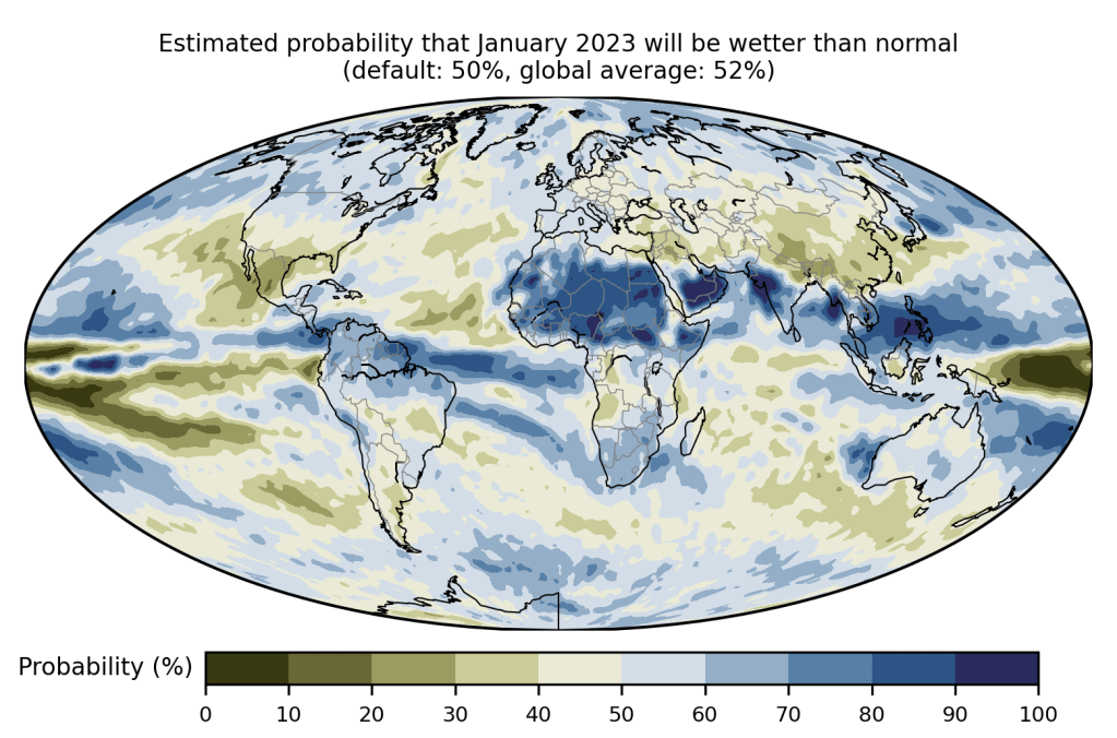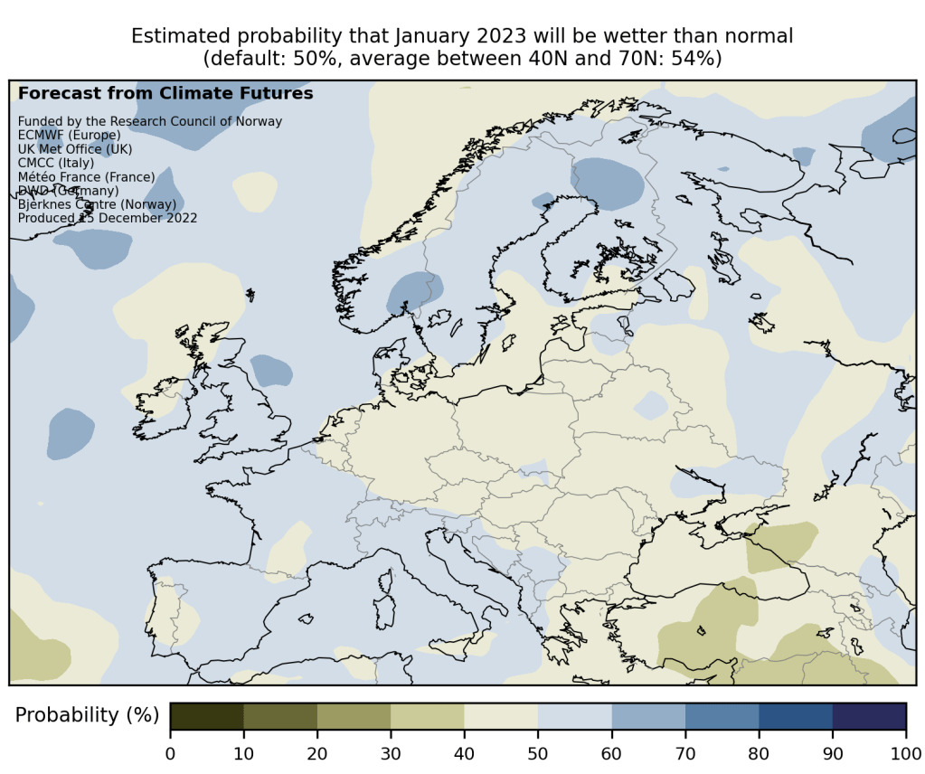 Figur 4. Sannsynlighet for at januar 2023 blir våtere enn gjennomsnittet for referanseperioden 1993–2016.