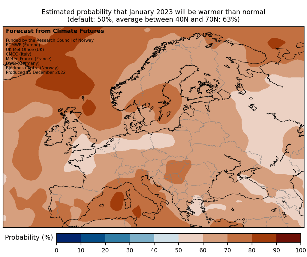 Figur 2. Sannsynlighet for at januar 2023 blir varmere enn gjennomsnittet for referanseperioden 1993–2016.