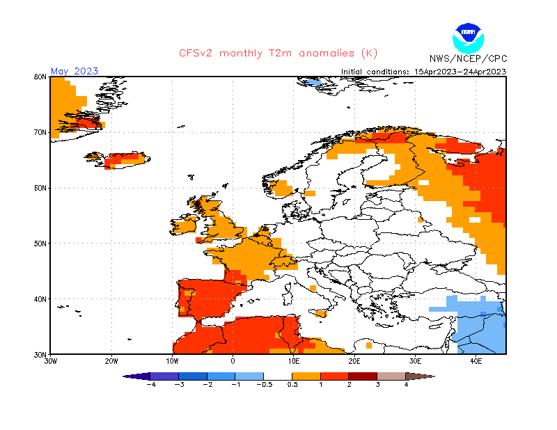 Vi kan også kikke på de siste prognosene fra amerikanske NOAA, denne gang for hele mai under ett. Bildet under viser gjennomsnittlig forventet temperaturavvik fra normalen. Klikk på bildet for å se prognoser for flere måneder frem i tid, men vær obs på at det er økende usikkerhet jo lenger frem prognosene går.