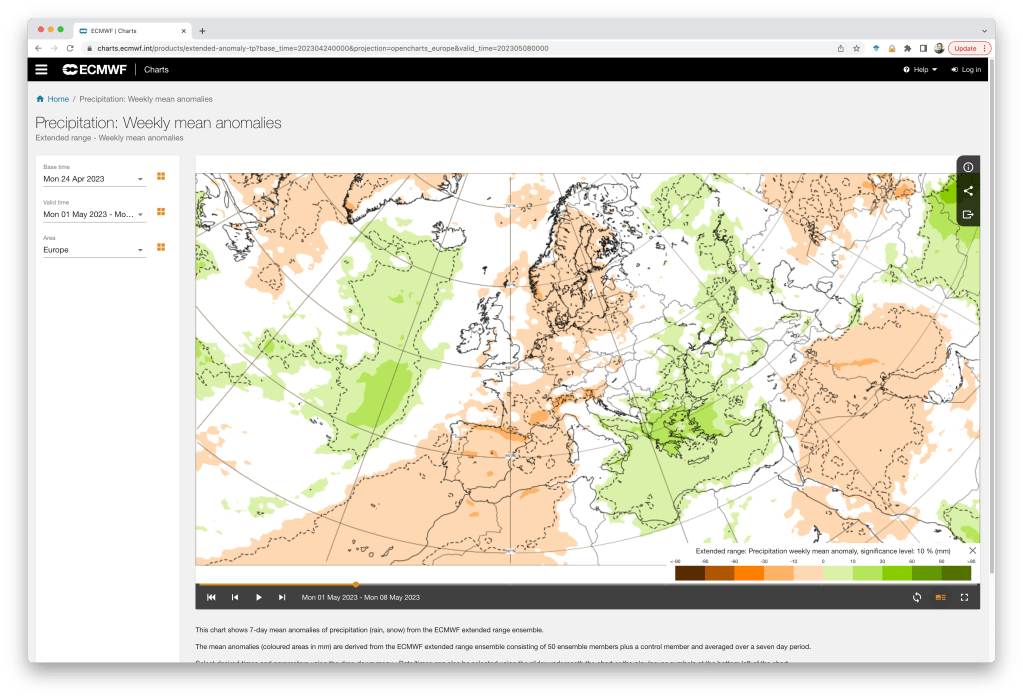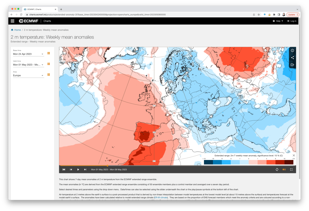 Blå farger indikerer områder med forventet lavere temperature enn normalt. Klikk på bildet for å komme til prognosesiden, der du kan navigere frem og tilbake i tid ved hjelp av piltastene.