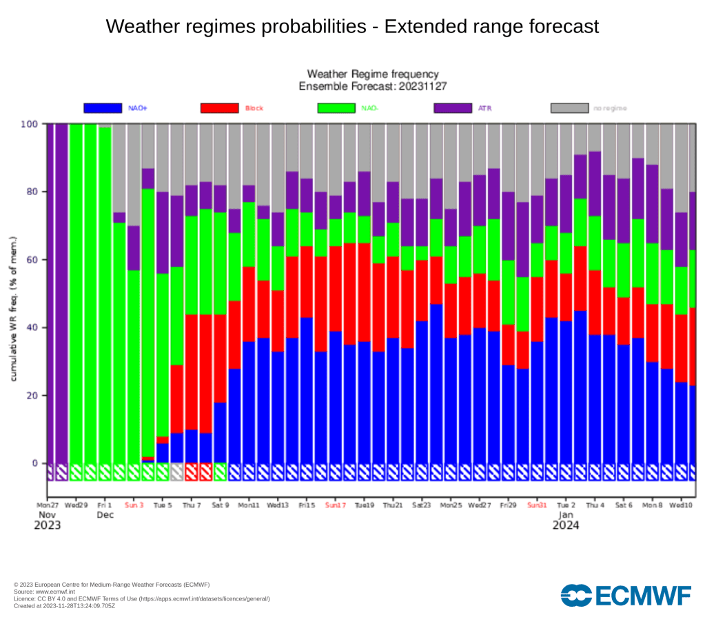De nærmeste dagene skal vi altså være i værtypen NAO–, noe som rimer godt med de kalde langtidsvarslene. Utover i neste uke øker sannsynligheten for andre værtyper, og fra neste helg (9.–10. desember) og utover er det omtrent en tredjedels sjanse for NAO+, altså en mildere værtype.
