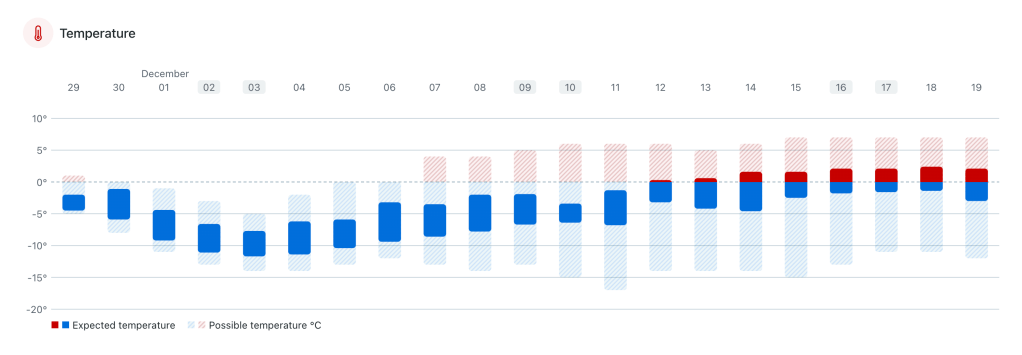 Det er ofte slik at vi i Nord-Europa opplever en kald værsituasjon før vinden svekkes i stratosfæren. I tillegg er det økt sannsynlighet for kaldt vær etter at vinden svekkes. I sum er prognosen over en indikasjon på at været kan holde seg kaldt i flere uker fremover.