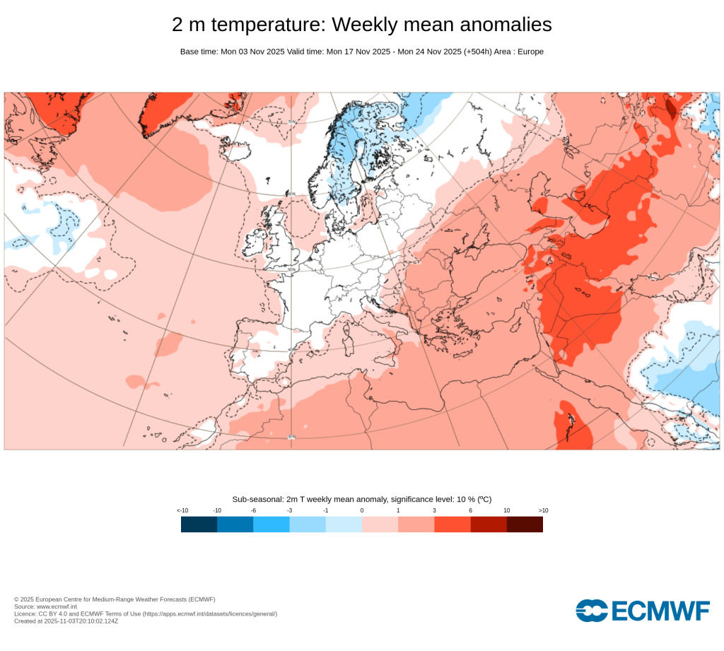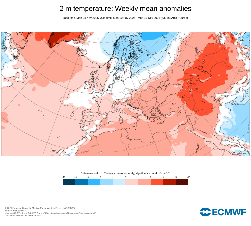 Slike situasjoner –høytrykk over Skandinavia – vet vi kan bidra til å «forstyrre» stratosfæren og øke sannsynligheten for en oppvarming der oppe. Det blir spennende å følge med på den videre utviklingen. Store deler av landet ser ut til å få betydelig kaldere temperaturer neste uke sammenlignet med denne milde uken. Her er forventet avvik fra normalen de neste tre ukene (gjennomsnittet av de 100 varslene), fra og med inneværende uke (klikk her for detaljer):