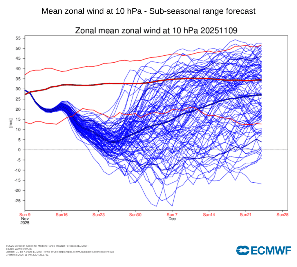 Tilbake til stratosfæren. De siste varslene antyder at det kan gå mot en tidlig oppvarming. Grafen under viser prognoser for vindstyrken høyt der oppe, på 60 grader nord. Det lages 100 slike varsler av ECMWF hver dag, og hvert av dem går seks uker frem i tid (klikk på grafen for å hente nyeste oppdatering og lese detaljer om hva som vises). Kort sagt: de blå kurvene viser alle 100 prognosene, og hvis de går under nullinjen, får vi en stratosfærisk oppvarming. Den tykke blå kurven viser snittet av de 100 varslene. Om det ikke blir en oppvarming, går det i alle fall mot en svekkelse av vindene der oppe, og dette kan føre til at samlebåndet med lavtrykk inn mot kysten vår svekkes.