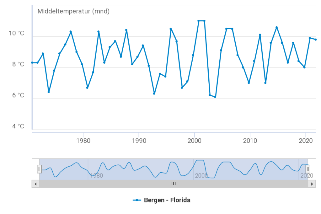 Det er særlig nedover på Kontinentet at vi finner høye sannsynligheter. Store deler av Norge ligger mellom 50 og 60 prosent. Når vi tolker dette, må vi ta med i betraktningen at normalperioden vår går helt tilbake til 1993. Siden den gang har temperaturen i Norge økt betydelig. Se for eksempel på årlig gjennomsnittstemperatur for Bergen på grafen under.