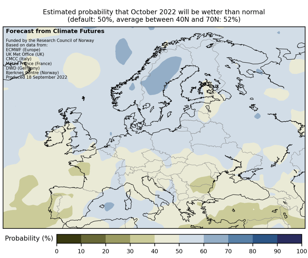 Sannsynligheten for at oktober 2022 blir varmere enn normalt (der normalen er gjennomsnittet i referanseperioden 1993–2021). Gjennomsnittet for området mellom 40 og 70 grader nord er 69 % på grunn av den underliggende oppvarmingstrenden (uten trend ville den ha vært rundt 50 %).