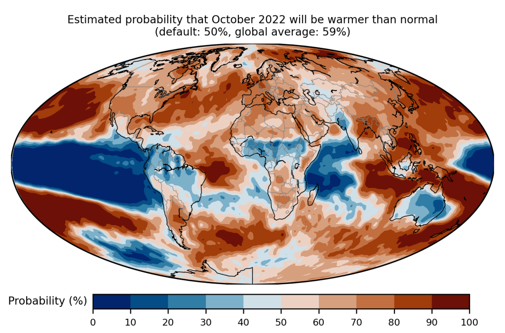 Sannsynligheten for at oktober 2022 blir varmere enn normalt (der normalen er gjennomsnittet i referanseperioden 1993–2021). Det globale gjennomsnittet er 59 % på grunn av den underliggende oppvarmingstrenden (uten trend ville den ha vært rundt 50 %).