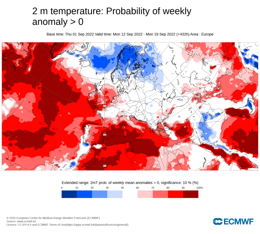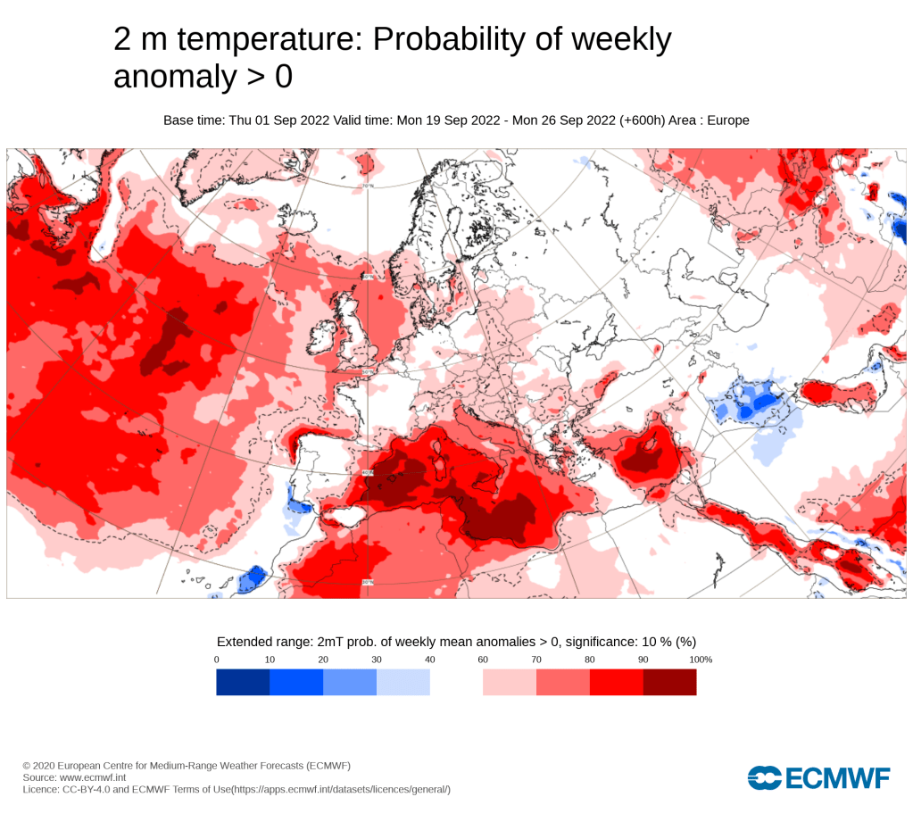 Under ser dere noen kart basert på det nyeste månedsvarselet fra ECMWF. Disse viser sannsynligheten for at de neste ukene blir varmere enn normalt. Hvis du ønsker å se flere kart, kan du klikke her for å komme inn på ECMWF sine sider, og der kan du bruke piltastene for å navigere frem og tilbake i tid.