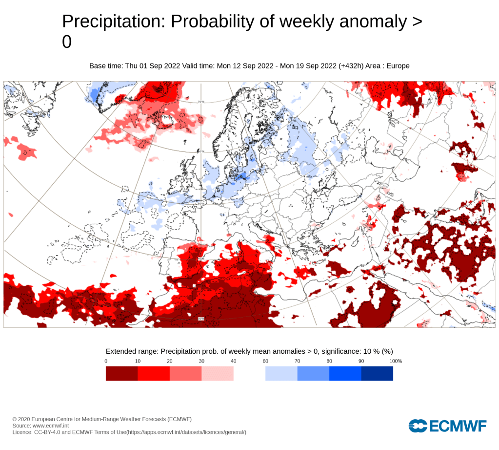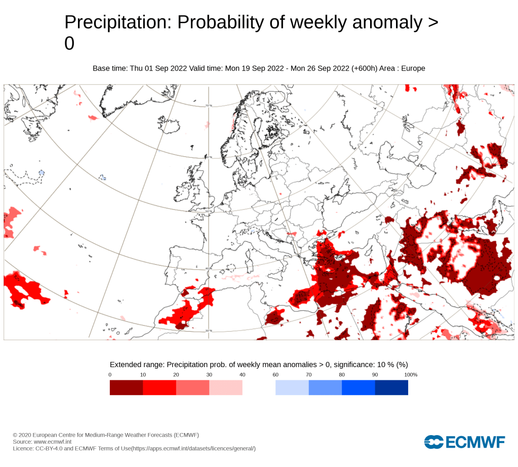 Vi ser nå på de nyeste nedbørsvarslene for de neste tre ukene. Her betyr røde farger at det er mindre enn 50 % sannsynlighet for tørrere forhold enn normalt.