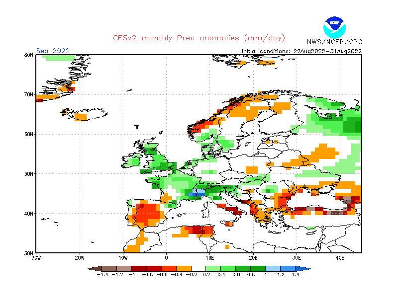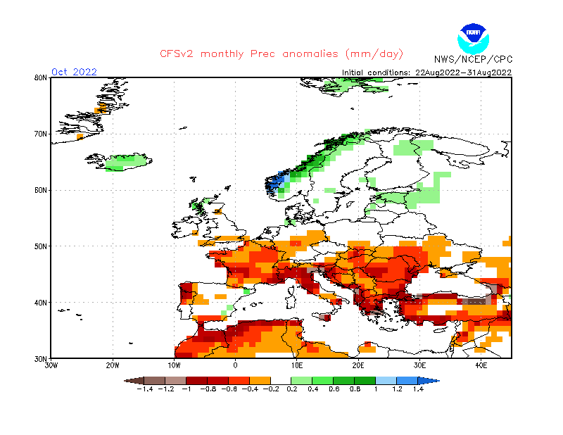 Til slutt tar vi med noen ferske amerikanske prognoser, som er basert på tilstanden i havet og atmosfæren i slutten av august. Under ser vi nedbørsprognosene for hele september og oktober.